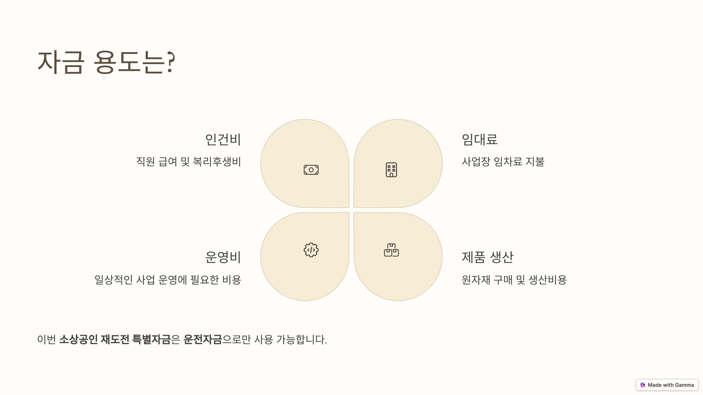 이번 소상공인 재도전 특별자금은 운전자금으로만 사용 가능합니다. 즉, 제품 생산, 인건비, 임대료 등 사업 운영에 필수적인 비용을 충당하는 데 사용됩니다.
