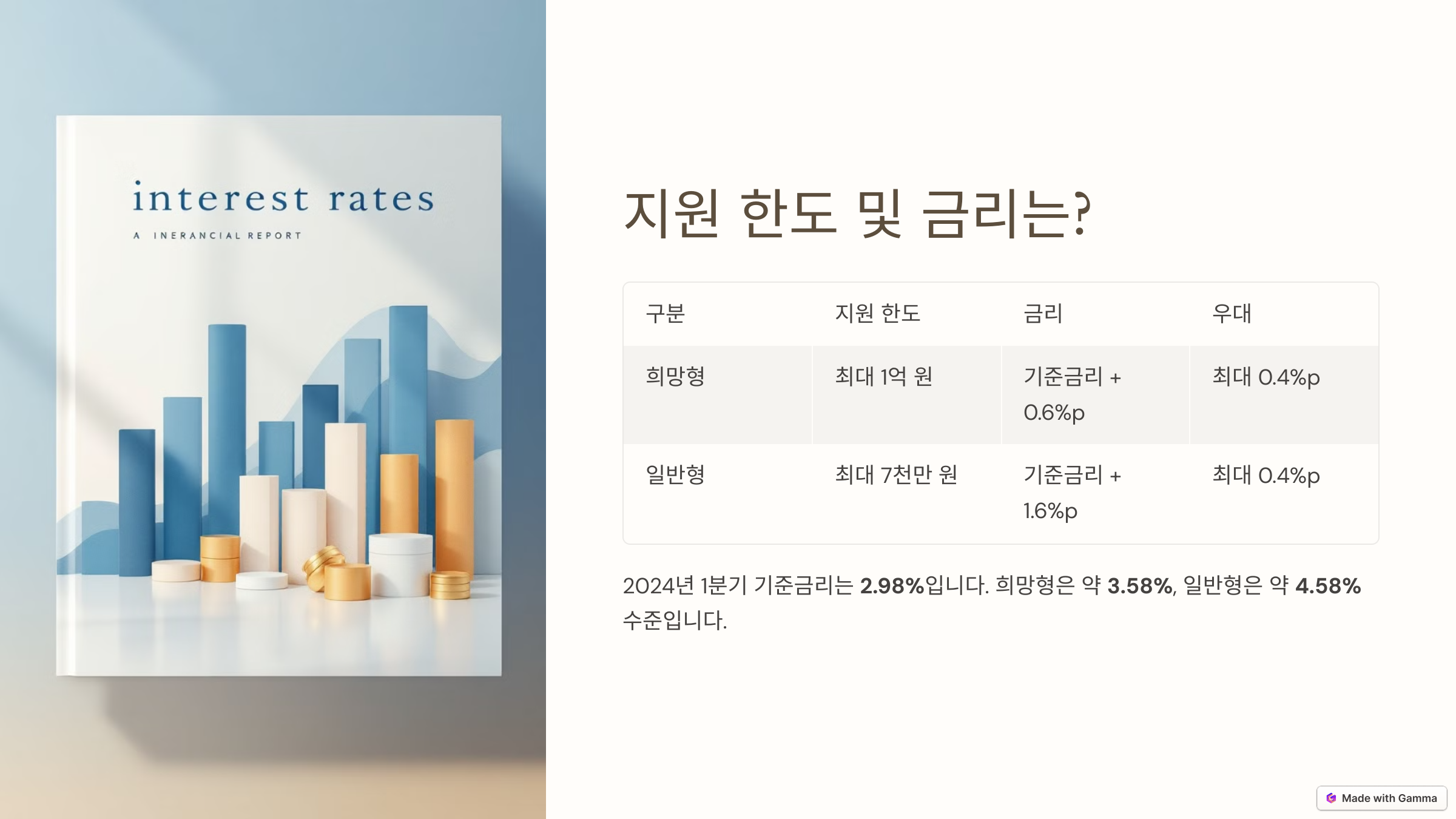 ※ 2024년 1분기 기준금리는 2.98%이며, 희망형은 약 3.58%, 일반형은 약 4.58% 수준입니다. 단, 금리는 분기별 변동됩니다.