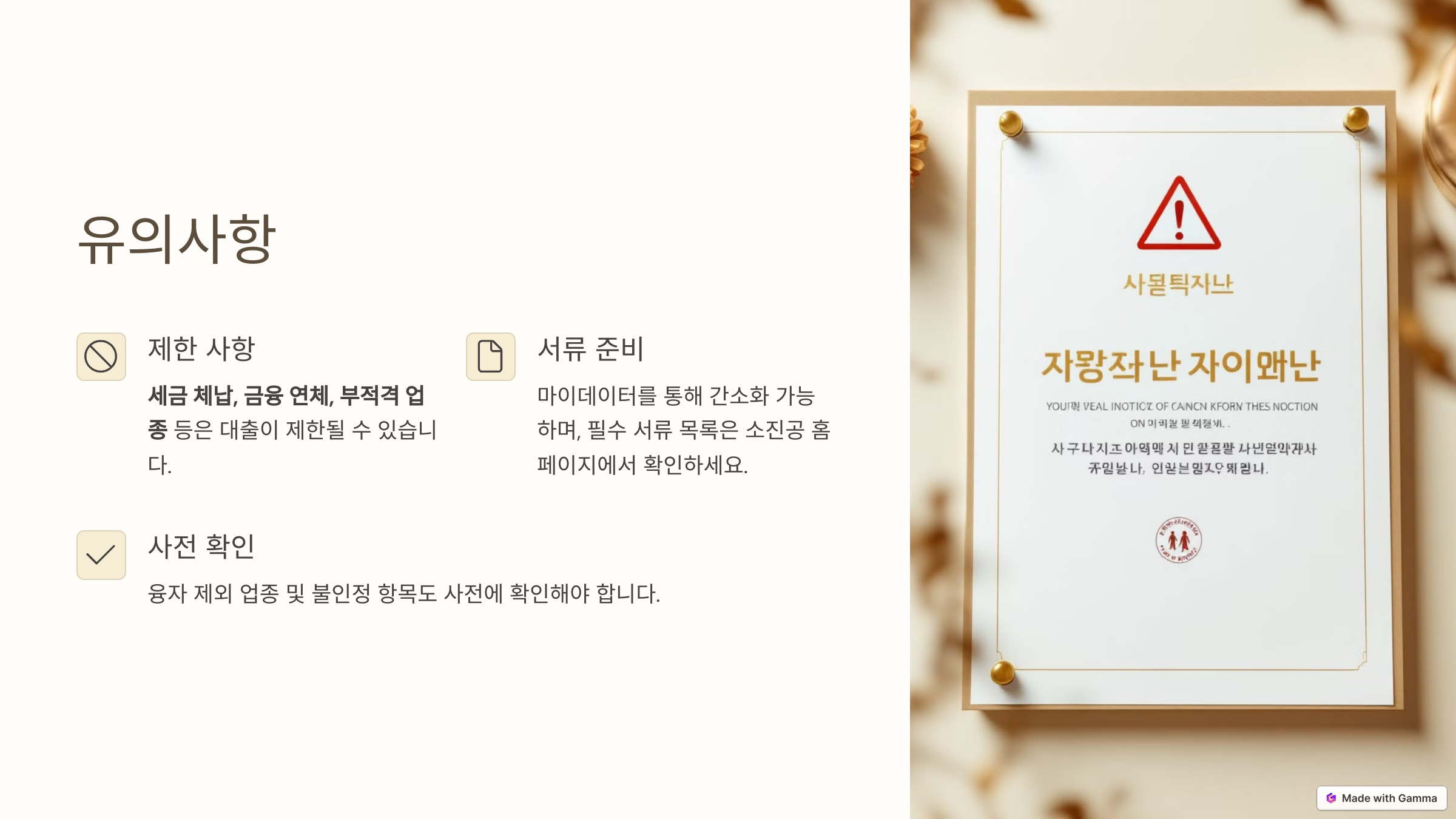 - 융자 제외 업종 및 불인정 항목도 사전에 확인해야 합니다.